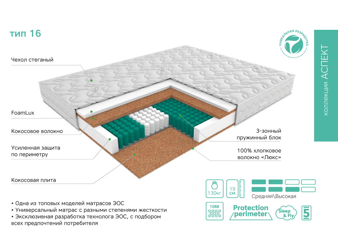 Матрас EOS Аспект 16 – это универсальны матрас с разными степенями жесткости.