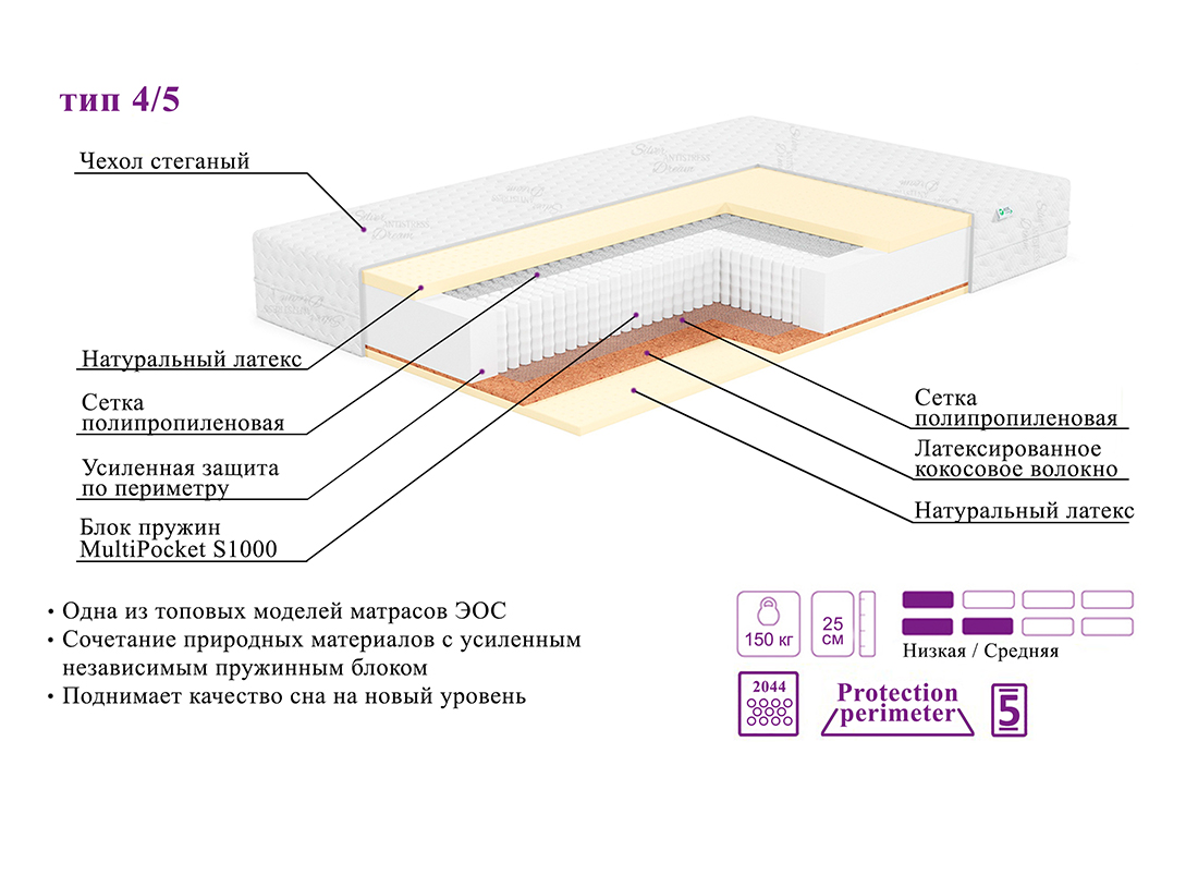 Матрас EOS Элит 4/5 – это уникальное сочетание природных материалов с усиленным независимым пружинным блоком.