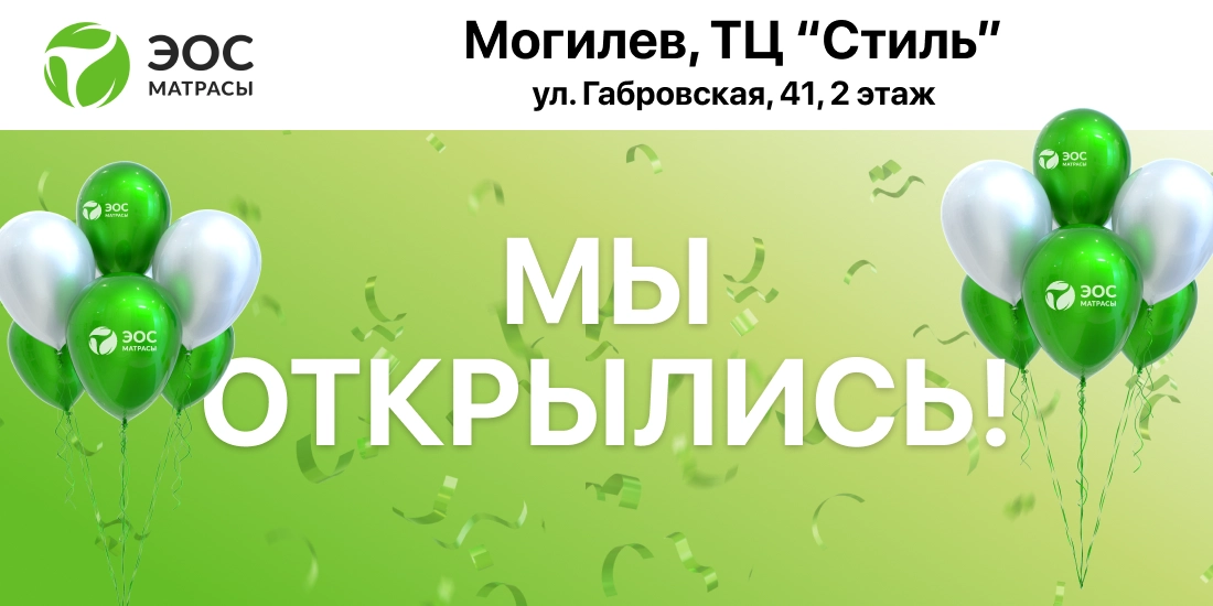В этом году мы, набрав обороты, открываем уже шестой салон! И на этот раз в Могилёве! И да, это первый салон в Могилёве и в Могилёвской области. Поэтому… торопитесь присоединиться к числу довольных покупателей матрасов, подушек, одеял, наматрасников, топеров и кроватей ЭОС.